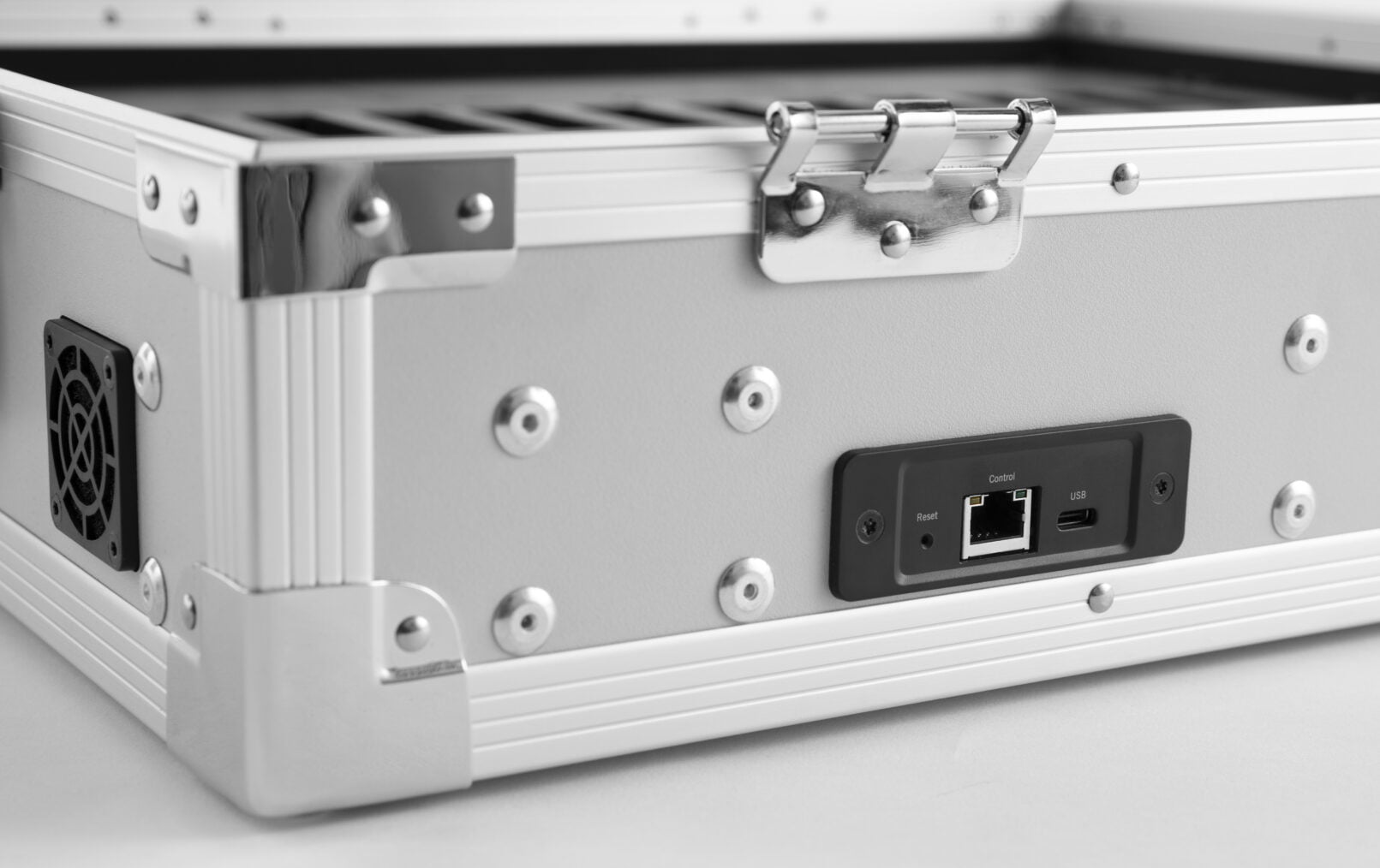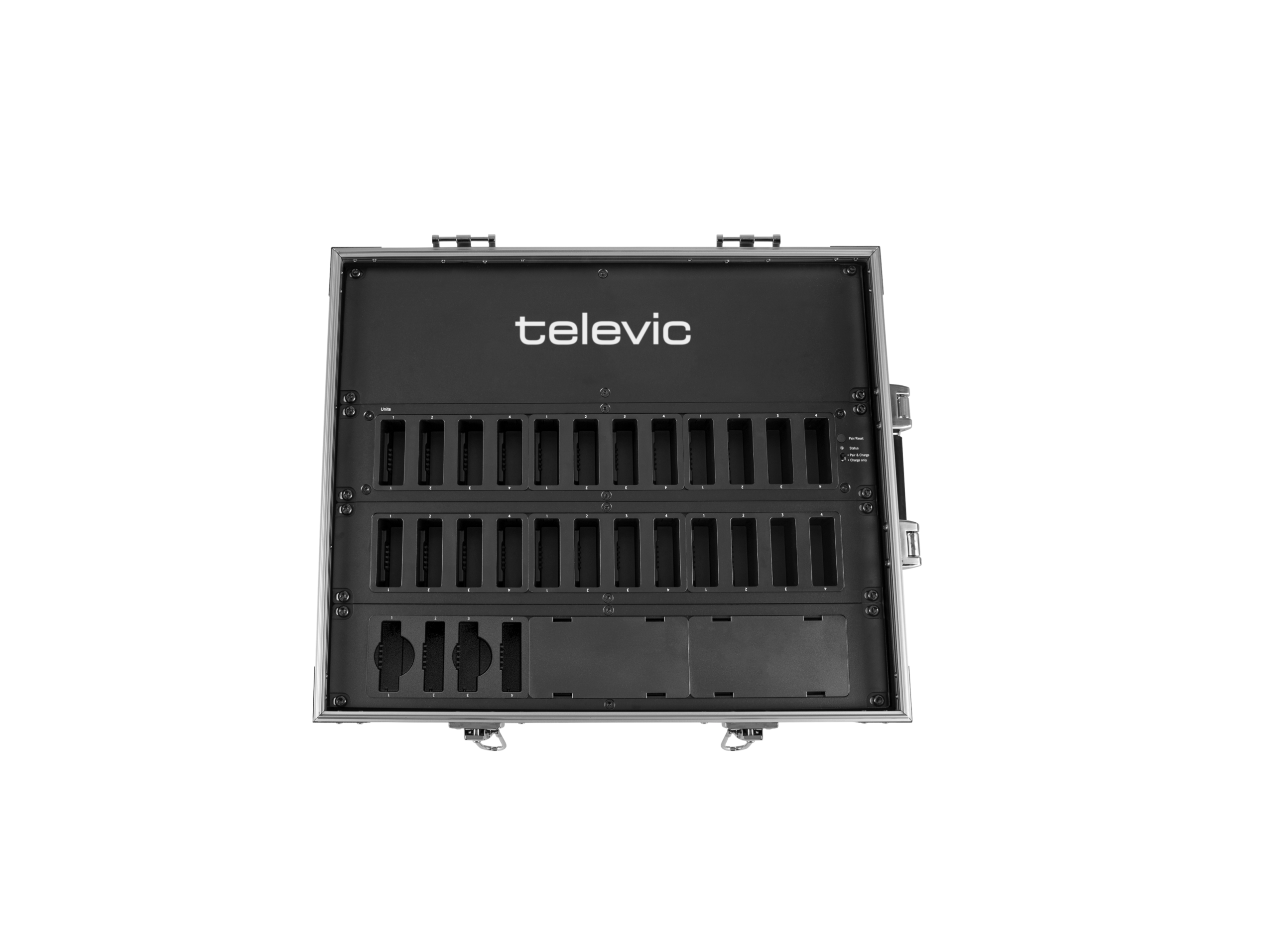 Unite CC est une mallette utilisée pour charger les batteries des émetteurs et des récepteurs Unite. La mallette peut être connectée au logiciel PC Unite Manager via le port Ethernet et il peut se combiner avec d’autres chargeurs et d’appareils Unit Cokpit.